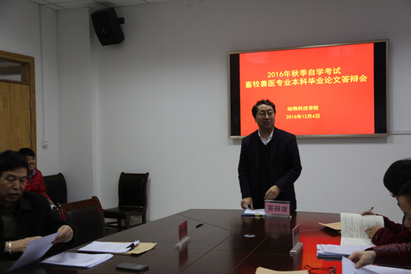12月4日,学院在104会议室举行2016年秋季自学考试畜牧兽医专业本科毕业论文答辩会,39名学生参加了毕业论文答辩。答辩主席、院长姚军虎教授,答辩委员于三科教授、孙世铎教授、王爱华教授、胡建宏教授、辛亚平副教授、孙小琴副教授等参加了答辩会。