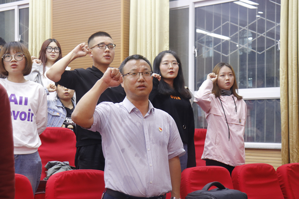 党课结束后,全体新发展党员和新进党员进行了入党宣誓,研究生第七党支部田博文同志领誓。
