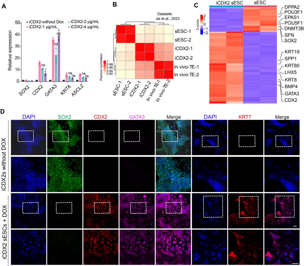 图1: 构建CDX2过表达的绵羊胚胎干细胞 A. QPCR分析CDX2诱导过表达条件下,滋养层细胞相关基因的表达水平。B. 热图展示绵羊ESC、iCDX2-ESC 与正常绵羊囊胚的体内滋养层细胞之间的转录组的比较。C. 热图展示绵羊 ESC 与 iCDX2-ESC中多能性基因和滋养层基因的表达情况。