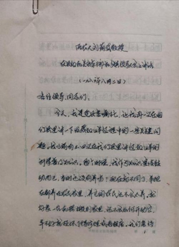左图为刘荫武教授签字审定的《全国奶山羊生产领导小组成员刘荫武教授谈:解决人民的蛋白质营养和发展奶山羊的问题》;右图为刘荫武教授1986年8月2日在千阳县县级机关和乡镇干部大会上所做的科学养羊演讲稿